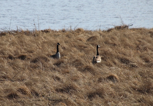 Två Kanadagäss har slagit sig ner i gräsmattan. Det finns gäss som flyttar söderut under vintern, men också de som stannar kvar i Sverige. Hur det är med dessa vet vi dock inte.