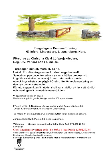 Bergslagens Demensförening återstartade 2015 efter att legat i träda 3-4 år. Vi har nu nära 60 medlemmar och de finns på många orter i de fyra norra kommunerna.