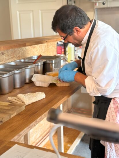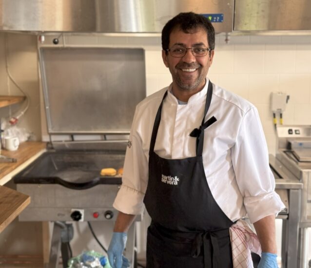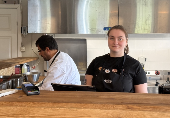 – Välkomna, sa Amanda Sjölander. Vi beställde varsin hamburgertallrik. Kocken är i bakgrunden.