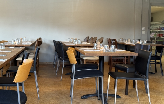 Gott om sittplatser finns det. På platserna till vänster sitter det matgäster. Fotot är endast på tomma bord.