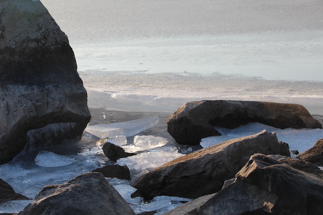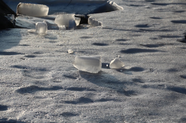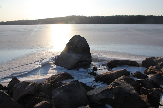 Jag fick foton på en fågel, lite vatten, träd, is och stenar.