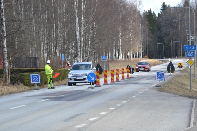 Fina vägförbättringar är på gång i Kopparberg och Bångbro men här gäller det att vara på sin vakt. Personerna på bilden står inte i givakt men är heller inte lediga utan har full uppmärksamhet på trafiken.