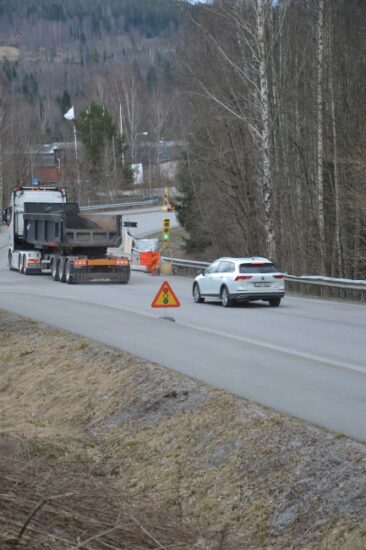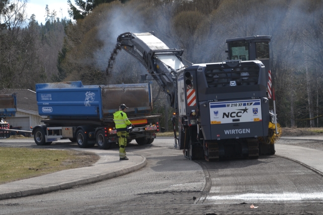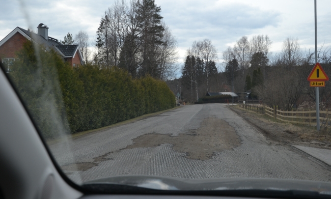 Här är det fotograferat genom bilrutan. Det kommer att bli en hel del pålägg för att få vägen fin. Våren är kommen och så även ny asfalt vad det lider.