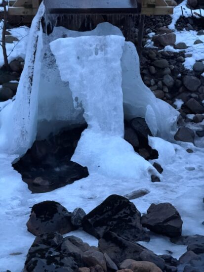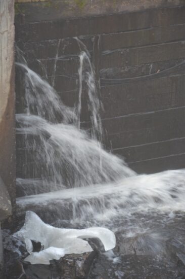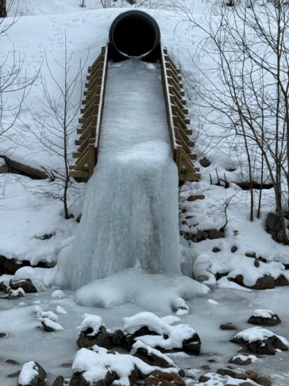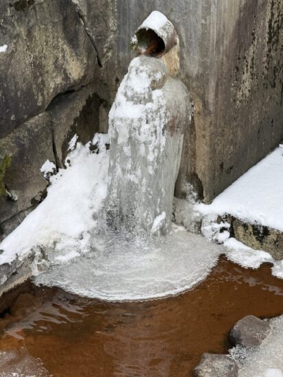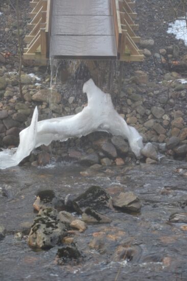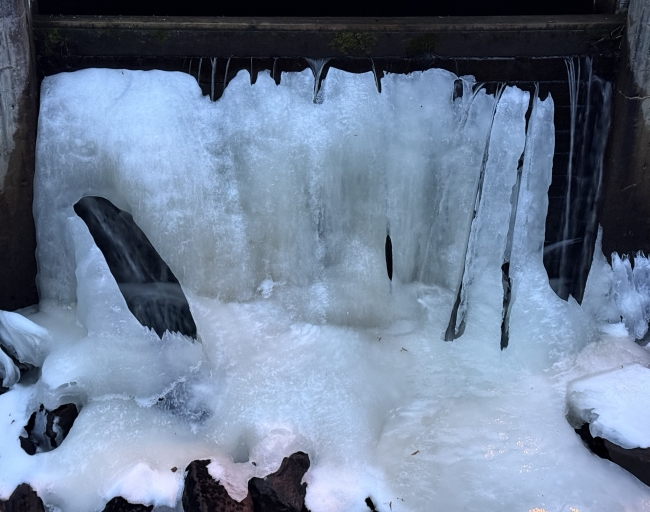 Vid Lyshusvägen nära brandstationen finns detta svarta hål. Här har det runnit vatten som frusit till en isränna. Minus 10 grader. En form av stilla vatten kanske?