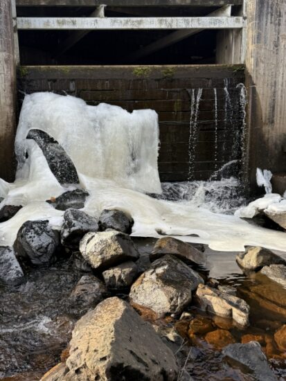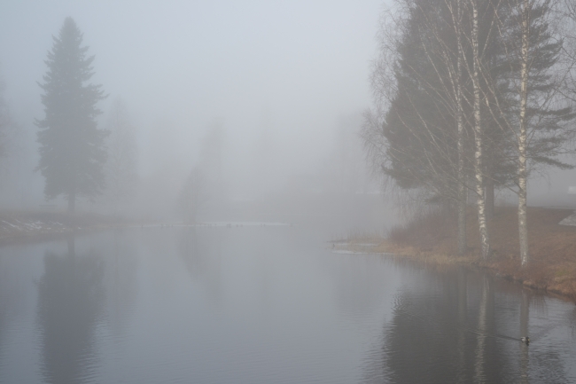Ovanför fördämningen råder det dimma. En ensam and paddlar sig fram med fötterna på egen hand.