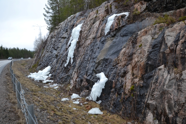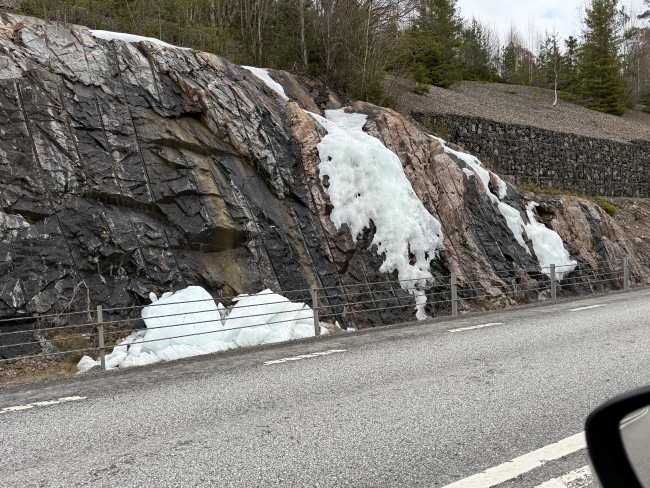 På väg söderut, två dagar senare, från korsningen väg 50 och väg 233 så uppenbarar sig detta. Nu ligger det massor av is i vägkanten. En form av tabberas. Ett snabbt förlopp när våren kramar ur vintern.